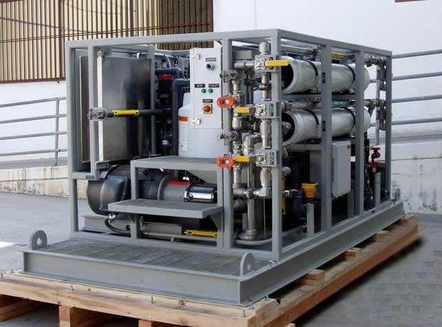 设备简介:6T/H 移动式海水淡化系统。 行业用途:海岛、舰船、海上工作平台,海水淡化生活饮用 产水水质:小于50μs/cm 设备流程:原水→多介质过滤器→活性炭过滤器→精密过滤器→中间水箱→反渗透设备→纯水储水箱→纯水泵→后置保安过滤器→用水点